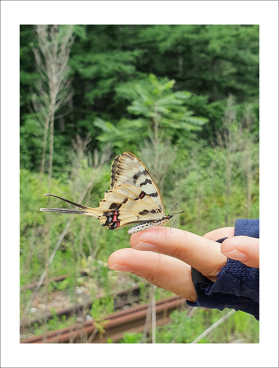 뒤에서 한참을 오지 않길래 가보니 나비와 씨름 하느라^^.ㅎ. 서산에 나비 박사님들께 물어 보니 꼬리명주나비 수컷이라 하는데 우화 한지 얼마 안되어 사람 손에 앉고 운동화에 앉고 그런가 보다고 합니다^^.