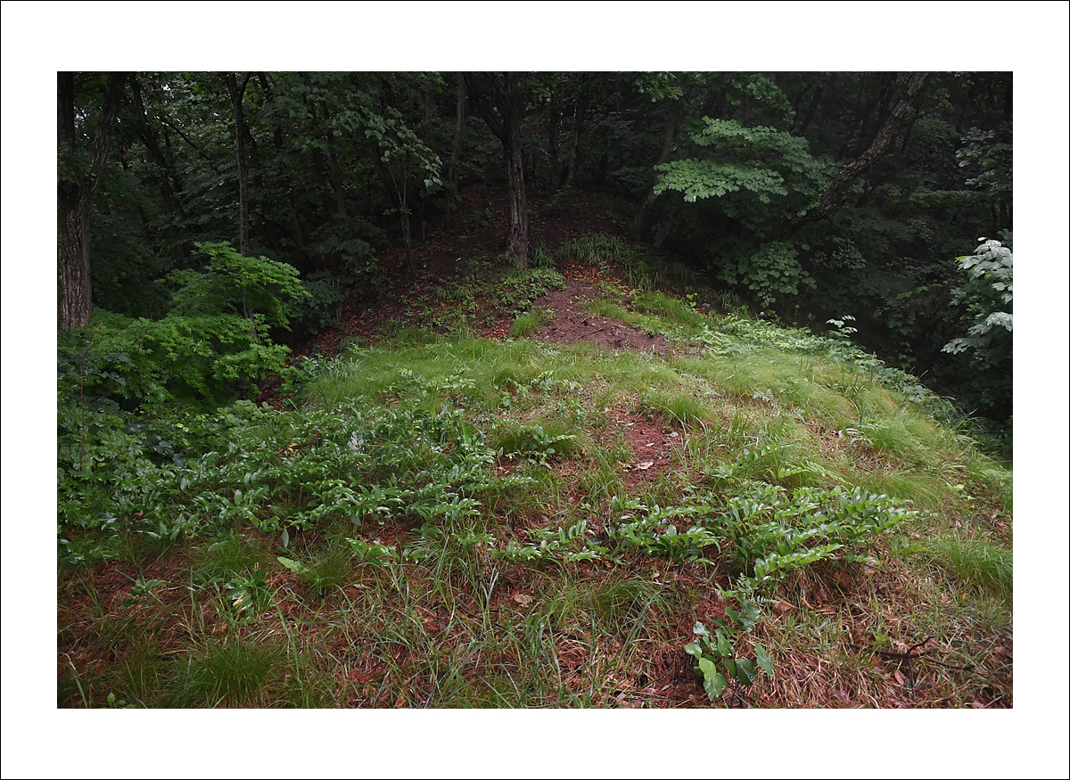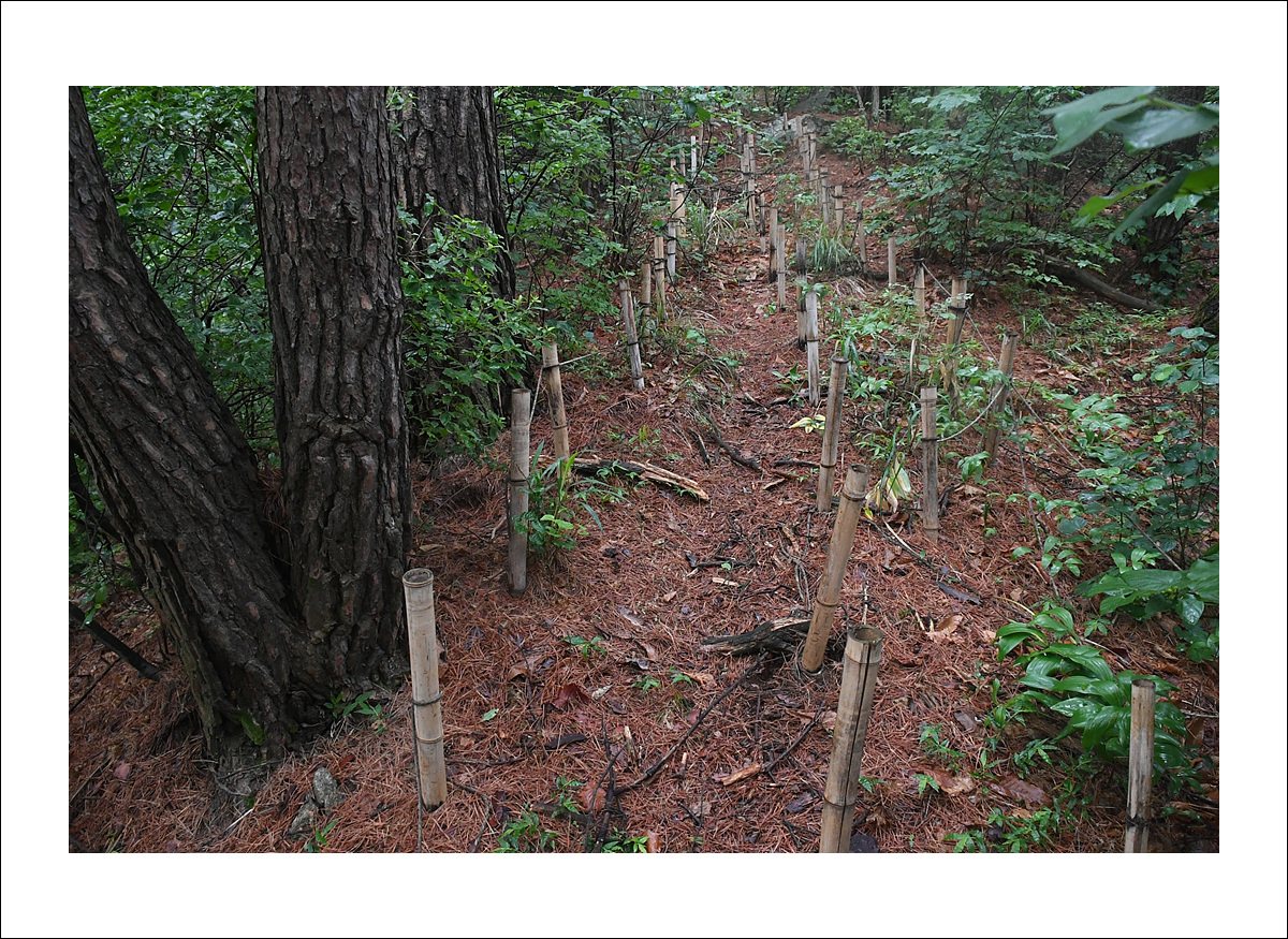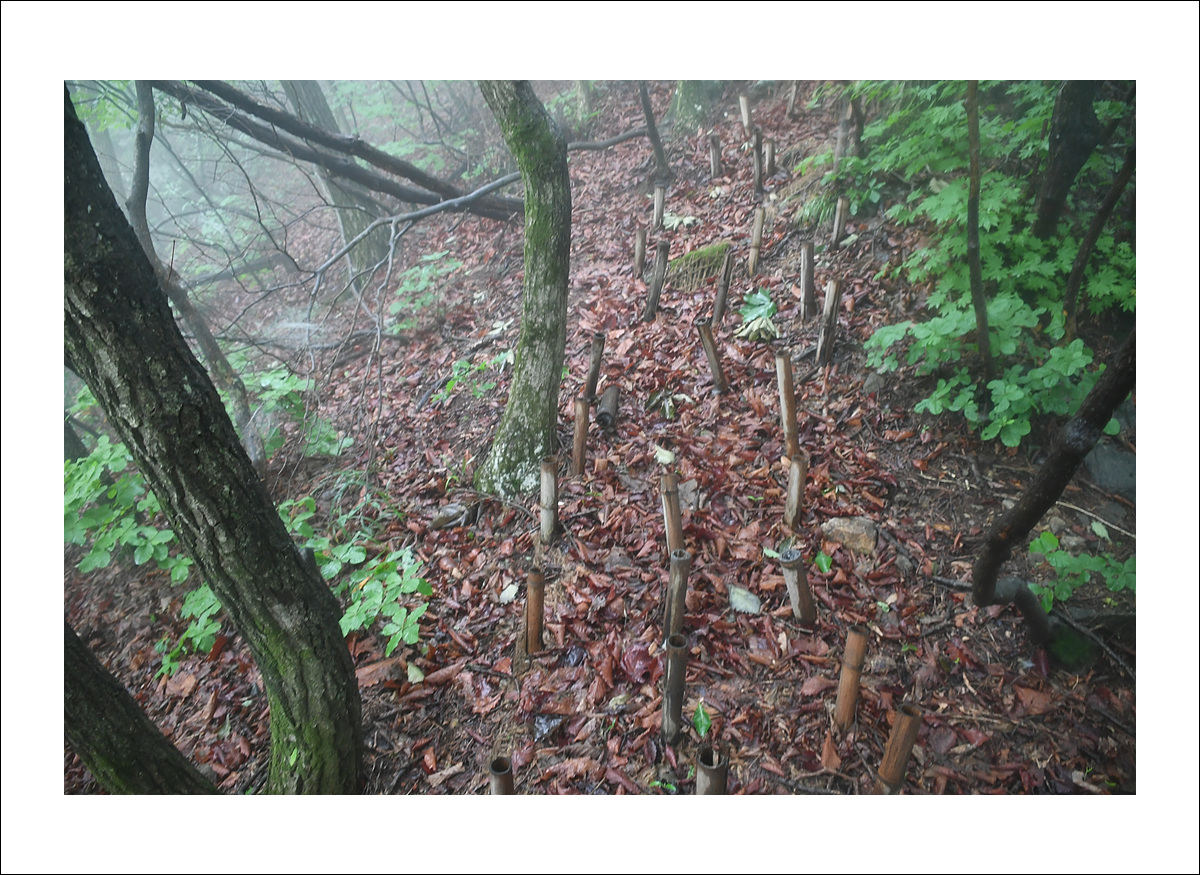그런데.. 이곳에서 잠시 착각을 하였습니다.. 대나무로 막아 놓은 곳이 예전 길인줄 생각하고 바로 직진하여 걷다가 지도를 보니 방향이 틀리네요.. 어차피 직진한거 그냥 능선을 타고 오릅니다.. 가파르고 아주 거친 산길 이더군요..비까지 내리는데.. 카메라 젖지 않게 해야지.. 힘드네요^^.