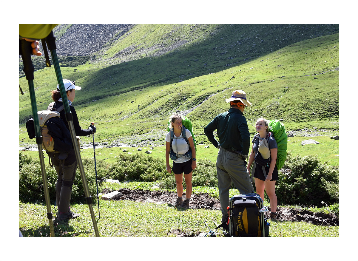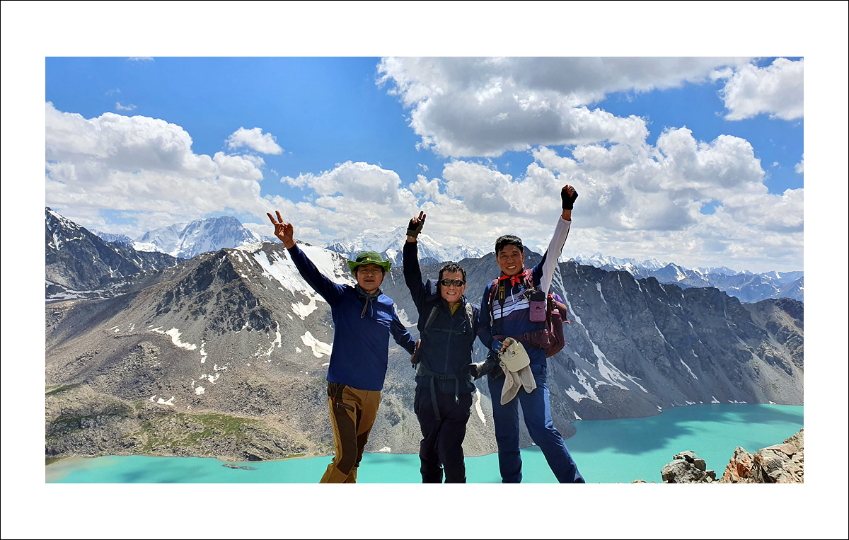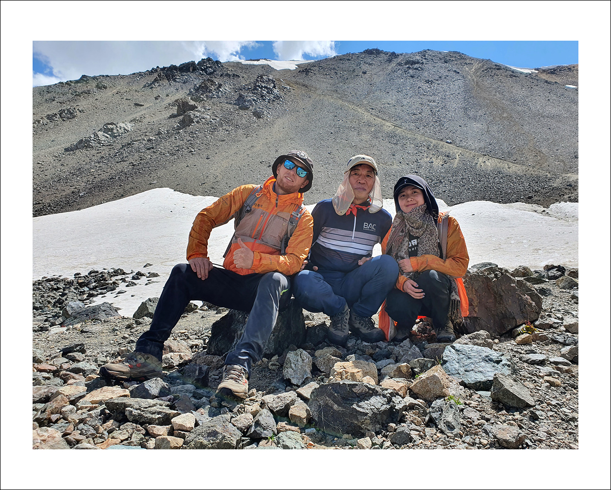 좌측은 후미 가이드 였던 (러시아인)..우측엔 키르기스스탄 대학생인데 아르바이트 생입니다. 이번 트래킹 일정에 2박 3일을 주방 보조와 통역을 하였습니다. (한국 이름은 가영 이라고요^^.) 이번에 처음 오른 것이라네요.