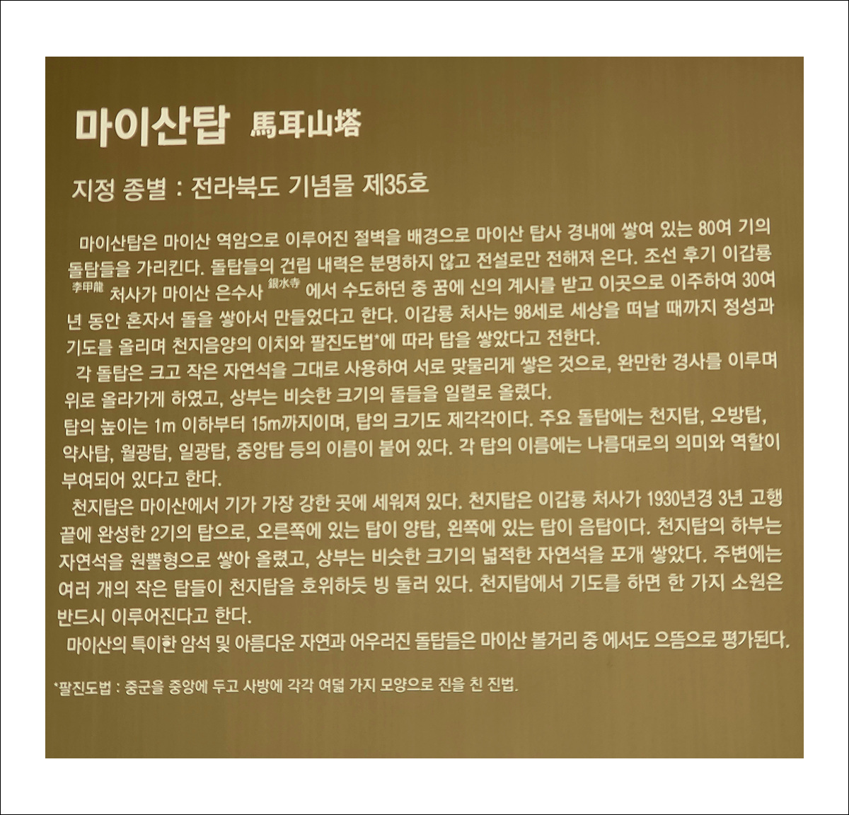 덕유산에서 일찍 내려와 진안으로 이동하여 친구를 만나 조금 늦은 시간에 마이산 남부쪽에 들렸다. 주차비는 무료이고 입장료는 성인 3,000원 인데 그곳에서 일하고 있는 친구빽으로 그냥 들어 갔어요^^. 원래는 차도 가지고 탑사까지 가려했는데 중간에 공사 중이라 길이 막혀서..못들어 갔네요^^. 주차장에서 탑사까지 1.6km 걷는 거야 뭐... 건강에도 좋지요^^.ㅋ